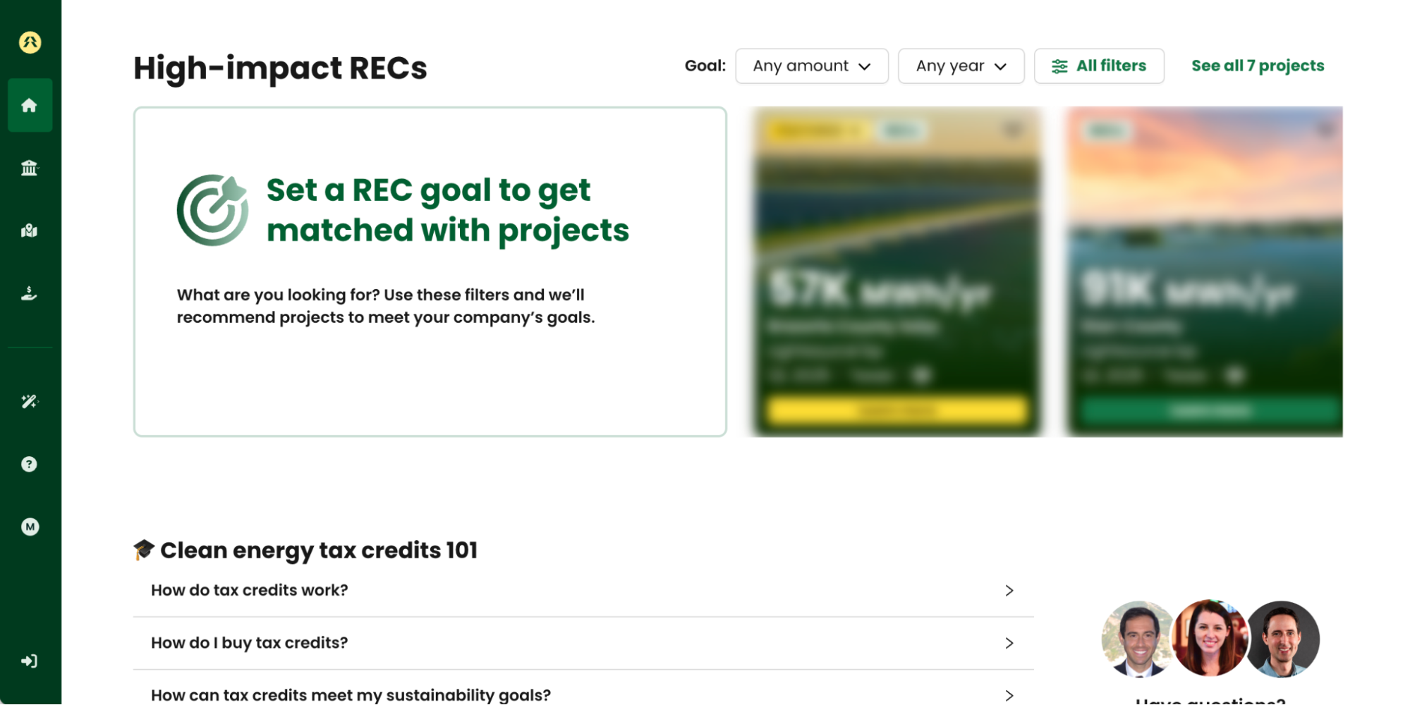 Ever.green is a marketplace for transferable tax credits and high-impact RECs. Accessible to corporate buyers of all sizes, these sales make more new clean energy projects happen. Companies like Atlassian, REI, Autodesk, Brooks Running, Stripe, and more come to Ever.green to upgrade how they meet their sustainability goals, invest in new renewable energy projects, and show leadership in the climate fight.