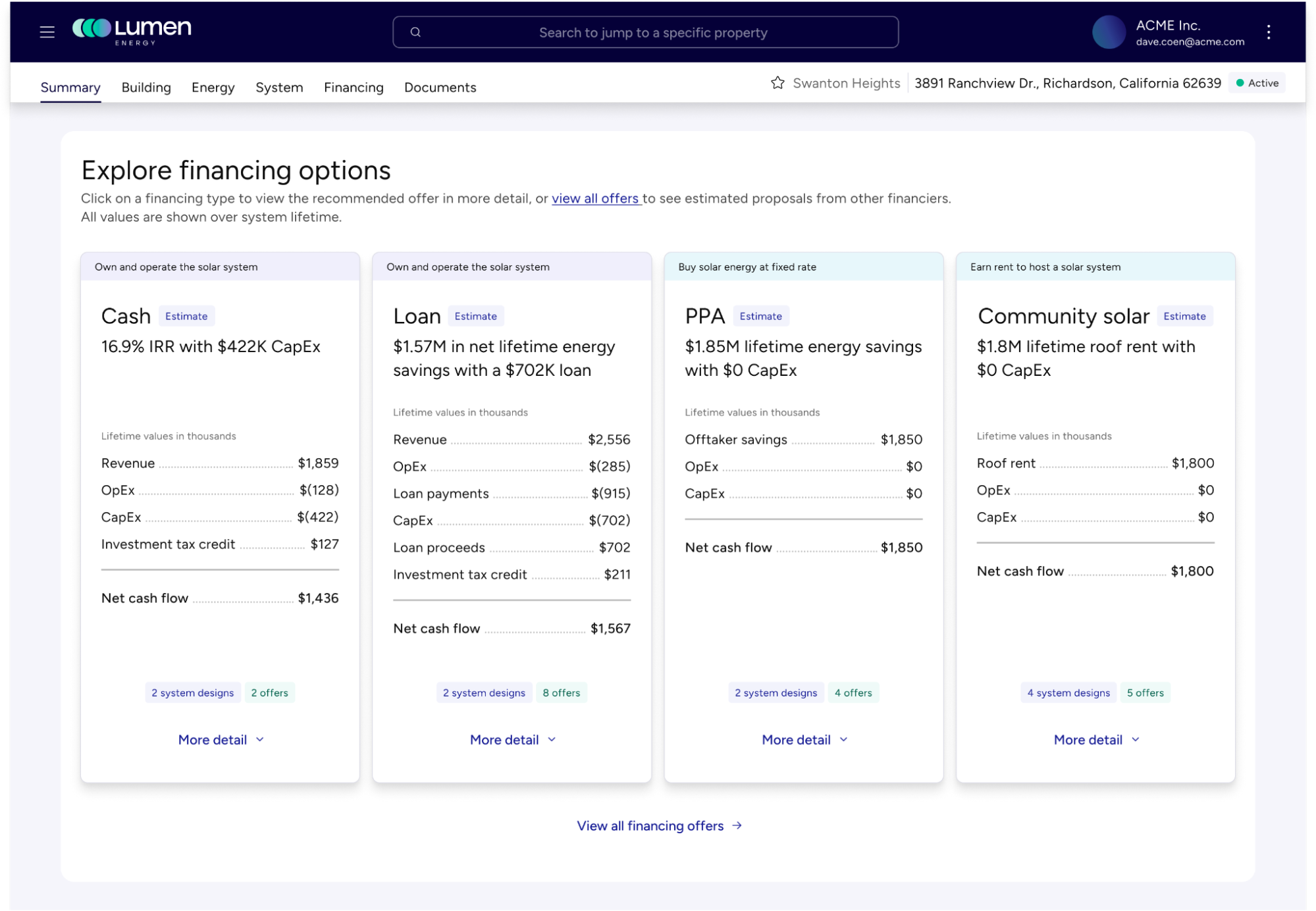 With a combination of cutting-edge data science, software, and deep sector expertise, Lumen Energy is making on-site clean energy accessible to commercial real estate owners, accelerating the transition toward sustainable energy. Lumen Energy’s proprietary pricing engine can remotely assess building features, utility bills, roof quality, credit, permitting, grid prices, and other constraints.