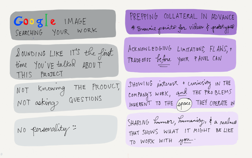 - Show too few visuals or too much polish. Don’t stick to the finished design. Show a spectrum of work that illustrates your design process and tells the story of how & why you landed where you did. Explaining tradeoffs and compromises should be part of the conversation.