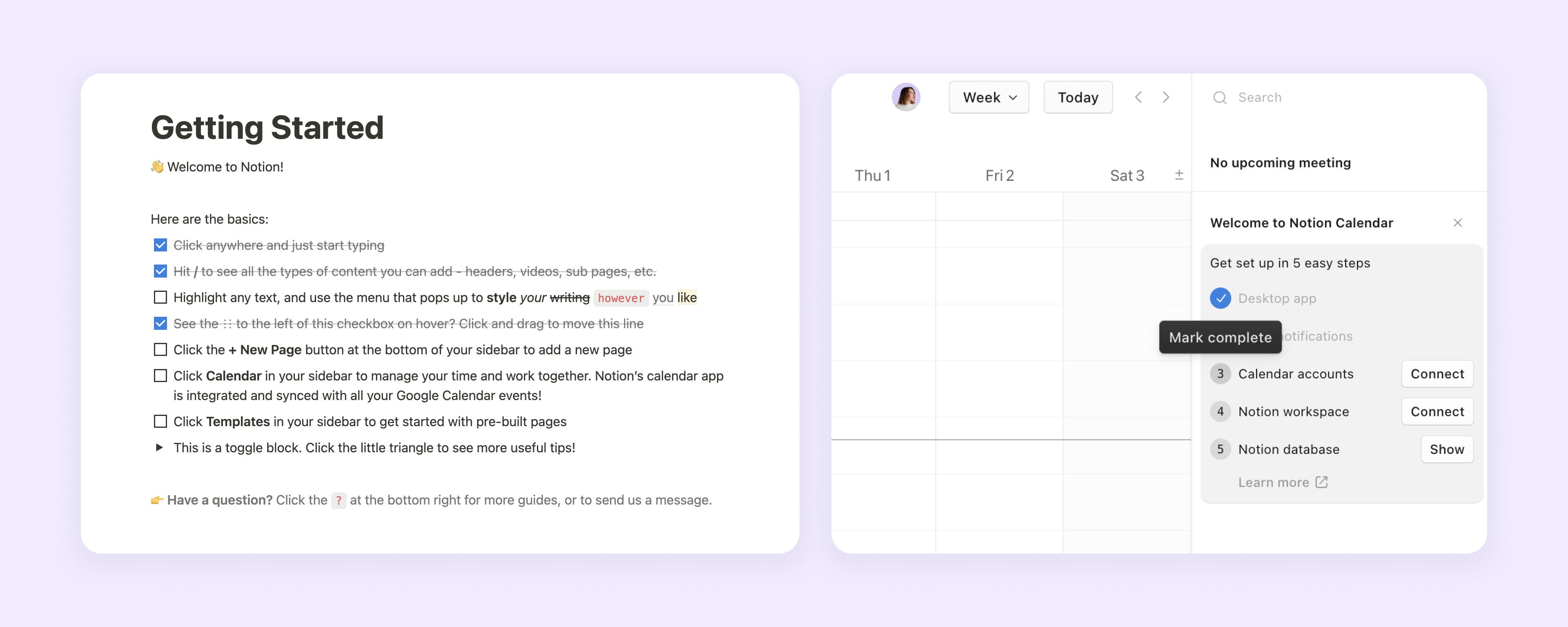 Notion's growth design approach centers on delivering immediate, clear value to users. Branded as an “all-in-one workspace,” Notion’s team understands the importance of living up to this promise from the outset. Their onboarding experience is simple yet effective, featuring a straightforward checklist that introduces users to core product features without relying on tutorials or pop-ups. This checklist-based approach allows users to explore Notion’s functionalities organically, creating high activation rates through seamless, integrated onboarding.