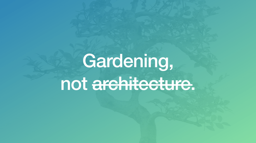 Inspired by an Oblique Strategies card, the “Gardening, not architecture” mindset recognizes that a culture cannot be controlled and that a certain level of nurturing and pruning is a far more healthy and realistic approach to cultivating a good system.