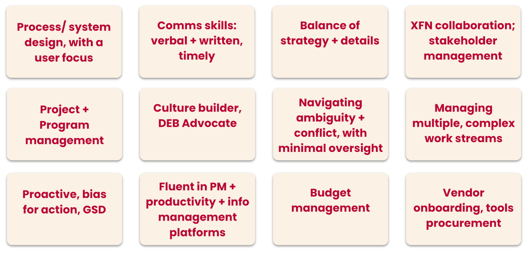 - Bonus Areas: Budget management, vendor onboarding, tools procurement, and familiarity with design tools, process, sprints