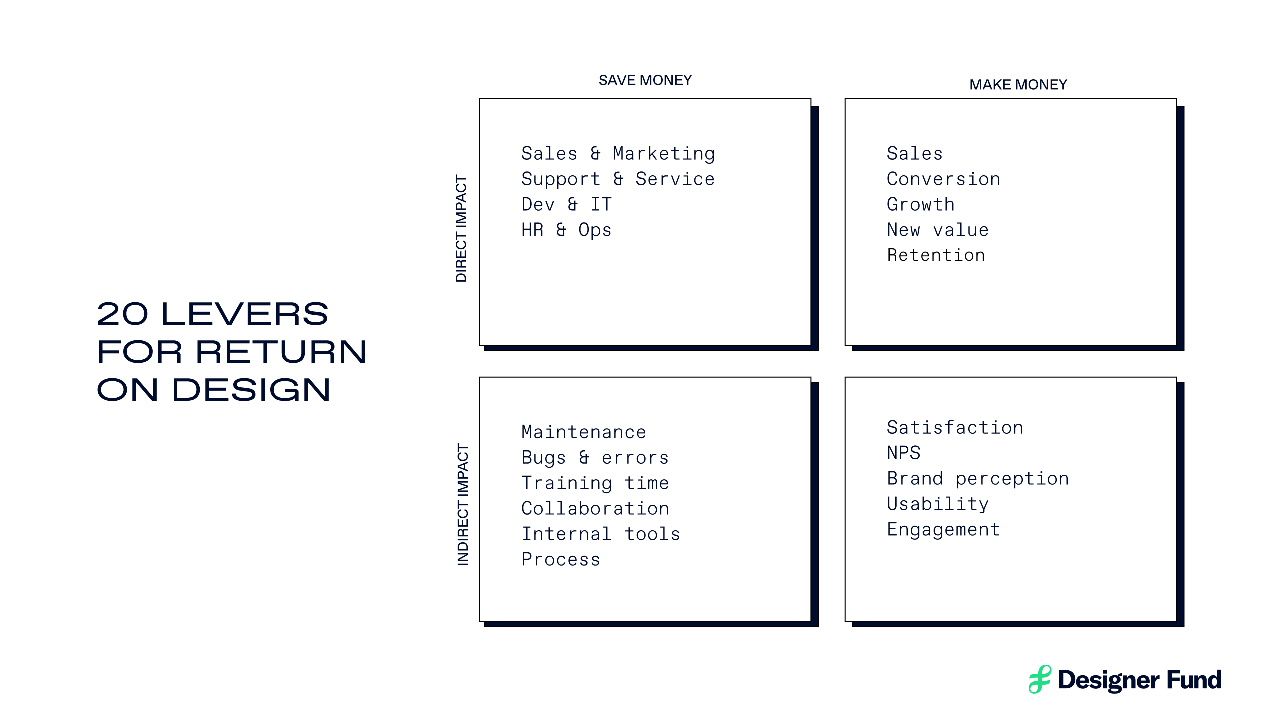 This approach can be broken into a framework, the 20 Levers for Return on Design, that I'm developing at Designer Fund to help designers show the value of their work and be more strategic.