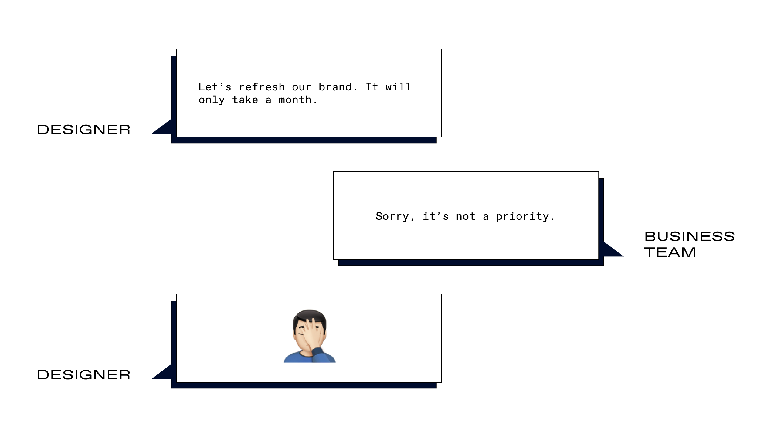 Another common example could be that your company’s brand is starting to feel out of date, and there are inconsistencies all over the place that you want to fix. You ask to do a light brand refresh, but your manager doesn't see why it's necessary to prioritize since the product is functional. Like most managers, they don't understand how your brand impacts key metrics like sales.
