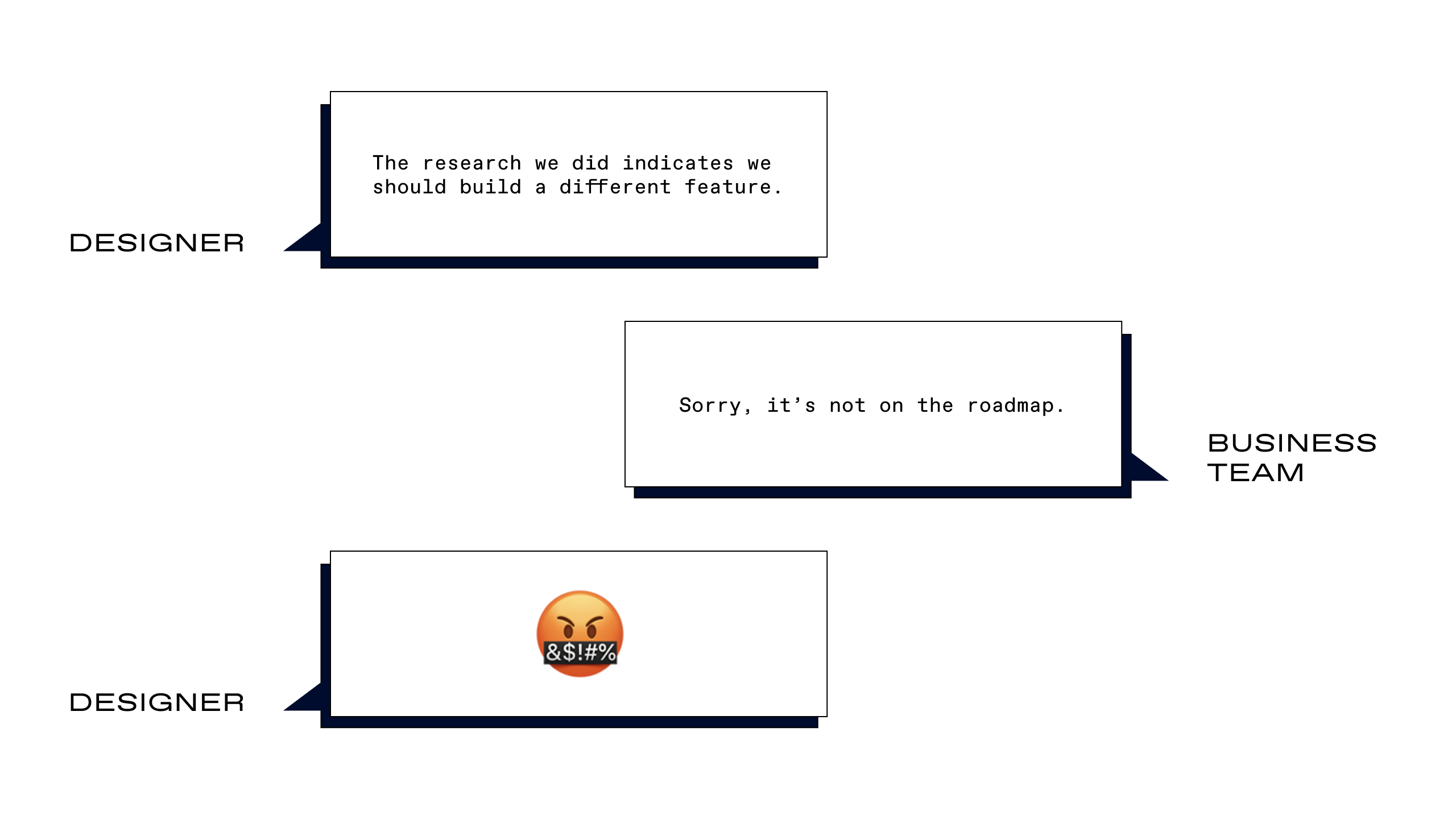 Even when you take the approach of conducting research to evaluate your hypotheses and present the case for a new feature, your pitch still lands flat if it doesn't fit into the roadmap for the company. Often our innovative ideas are too late to affect the strategic direction of the business.